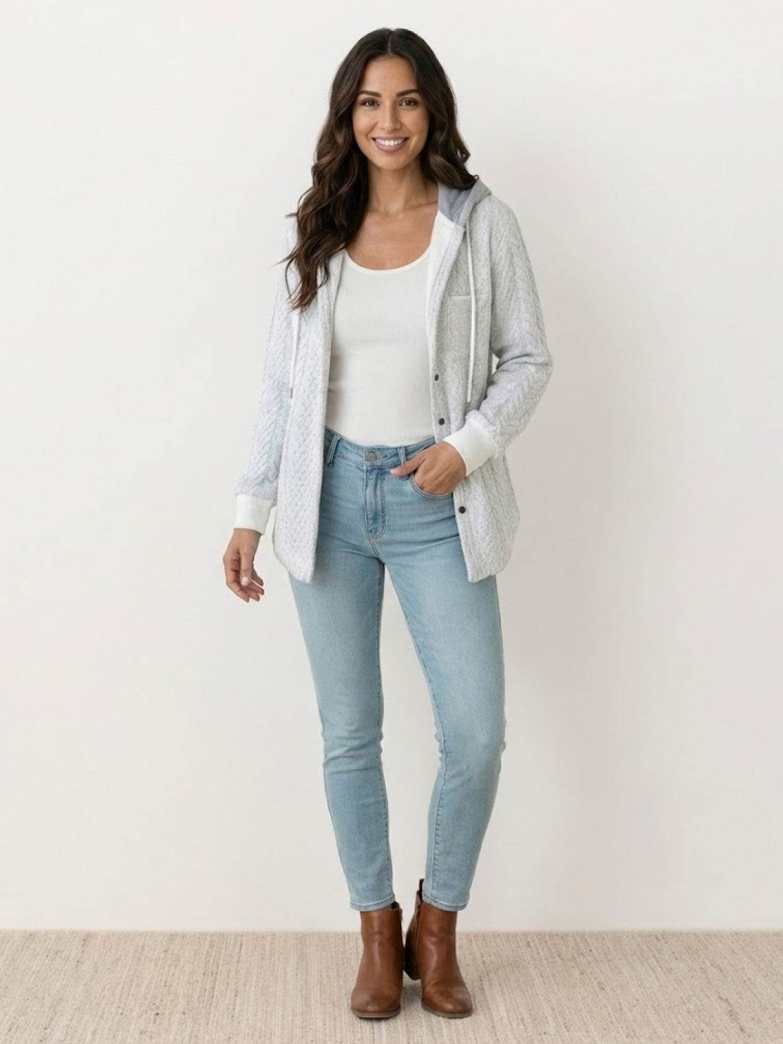 The Highland Plaid Shacket combines classic plaid with soft fleece lining and a relaxed hooded fit—an easy, cozy piece that carries you through cool-weather days in style.