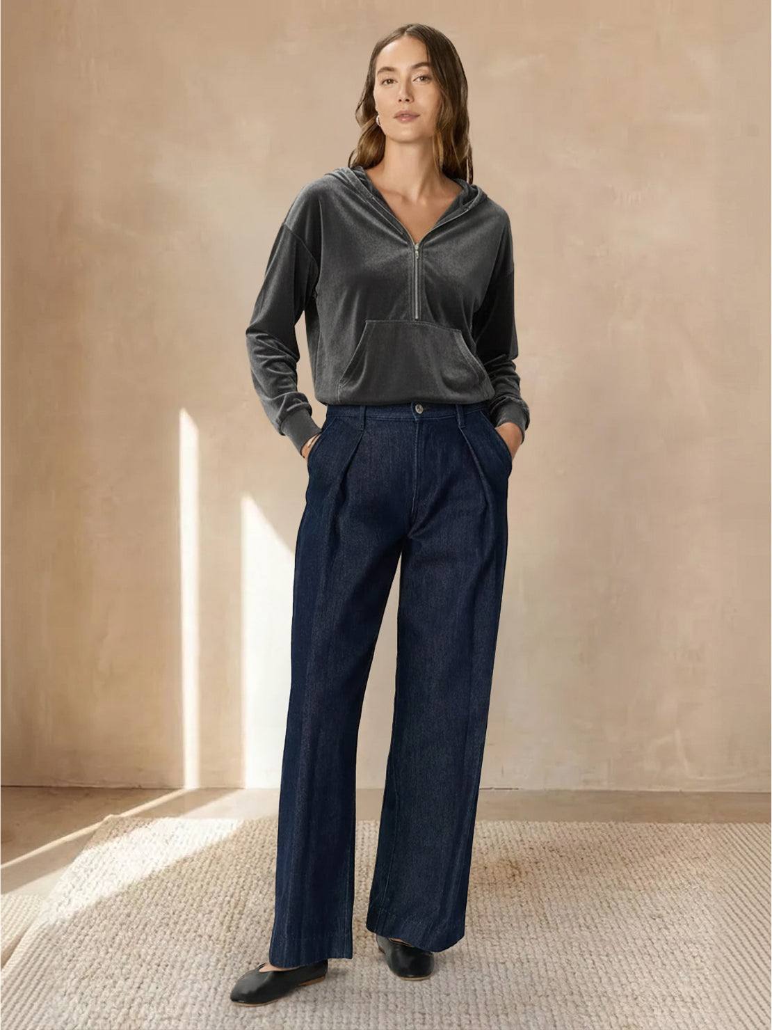 This hooded velvet top combines warmth with breathability for year-round comfort. The half-zip design allows you to adjust coverage, while the soft drape skims your body without clinging. The kangaroo pocket adds function, and the relaxed tunic length offers coverage that moves with you.