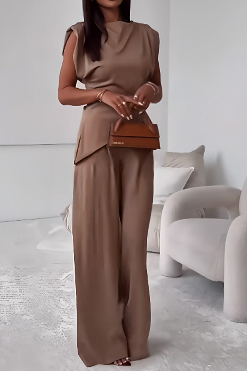 Style Note: Contemporary two-piece set featuring asymmetrical draped sleeveless top and wide-leg palazzo pants. Perfect for professional events, social gatherings, or refined casual occasions. Pair with block heels for work or strappy sandals for weekend elegance.